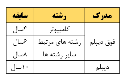 • مدیران عامل با مدرک تحصیلی پایین تر از کارشناسی باید سابقه مرتبط با امور انفورماتیکی مطابق جدول زیر داشته باشند.